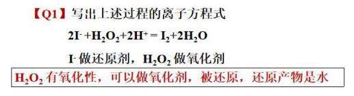 [生2] H2O2中氧元素显示-1价,-1价的氧元素化合价可以降低转化为-2价;化合价降低,被还原,发生还原反应;所以,H2O2应该具有氧化性,可做氧化剂,还原产物是H2O。H2O2中氧元素的-1价还可以转化为0价,化合价升高,被氧化,发生氧化反应。所以,H2O2应该具有还原性,可做还原剂,氧化产物是O2。