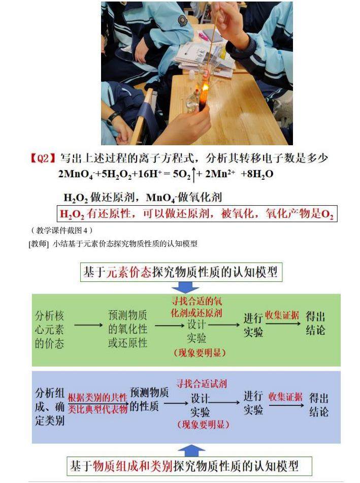 [教师] H2O2我们在初中就有所了解,该物质可以分解制取氧气。通过前期的学习我们已经知道,可以基于物质的组成和类别预测物质的性质,也可以基于物质的核心元素价态预测物质的性质。在物质分类的学习中,我们认识了氧化物的再分类,H2O2显然属于氧化物,从其性质再细分,H2O2属于过氧化物,而不属于酸性氧化物或是碱性氧化物,为什么?