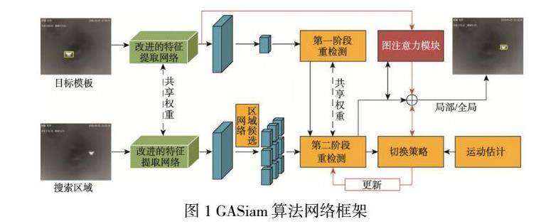 SiamR-CNN通过两级双生结构进行再探测。已有研究证明,这种架构能更好地处理UAV中的目标丢失问题,因此,本项目引入一种双重再探测的双层孪生架构,从而有效地减少了在目标丢失情况下的再发现与跟踪。如图1所示,图1显示了GASiam算法的网络结构。