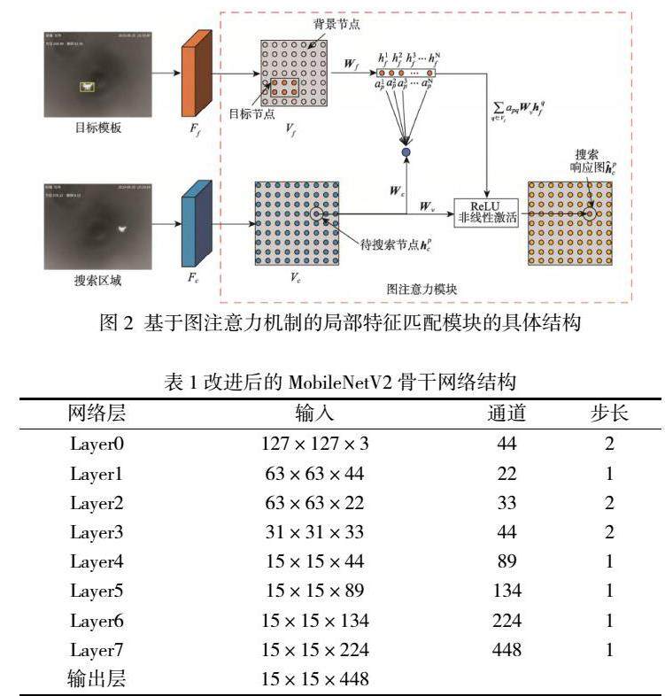 基于上述分析,本项目提出了一种新的思路,即与仅对图像块进行对比的互相关算法相比,图神经网络能够将目标特征以节点的方式进行学习,并将其与待搜索区域间的对象特征进行有效的转移。项目针对UAV中目标形变问题,拟融合图神经网络与注意力机理,引入人信息嵌入模型,设计基于图注意力机制的局部特征匹配模型,以解决UAV中目标形变问题。同时提出了一种新的基于图的视觉感知模型,该模型包含了一种新的视觉感知方法,它是一种新的视觉感知方法。如图2所示,每一个检索结点都是由相邻的目的结点所提供的信息来重构的。改进后的MobileNetV2骨干网络结构如表1所示。