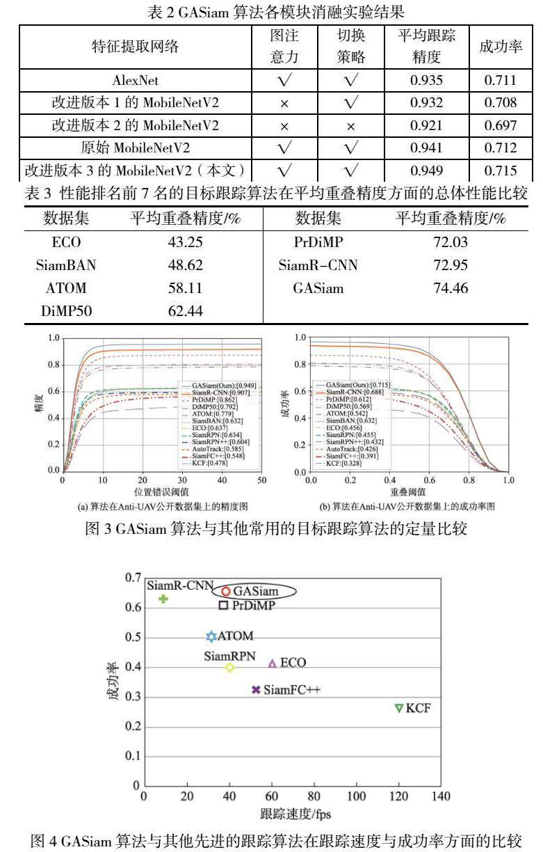 在反无人机公共数据库中,GASiam获得了74.46%的高分。另外,GASiam算法相对于标准的SiamR-CNN算法有较大提高,说明该三个模块在红外UAV目标跟踪中的优势。最后,利用反无人机数据,对GASiam算法进行了性能测试,并对其性能进行了对比分析。GASiam算法的运算速度是38帧/秒,满足了25帧(25帧)对实时性能的要求。由于GASiam的局部/全局转换机制,使得该方法的运算速度相对于SiamR-CNN(8 fps)有了明显的提高。此外,尽管SiamFC++与KCF(120 fps)的性能要比GASiam高,但是其追踪的成功率却低于GASiam。从这一点可以看出,GASiam算法既能提高目标的跟踪准确率,又能满足实时性要求。