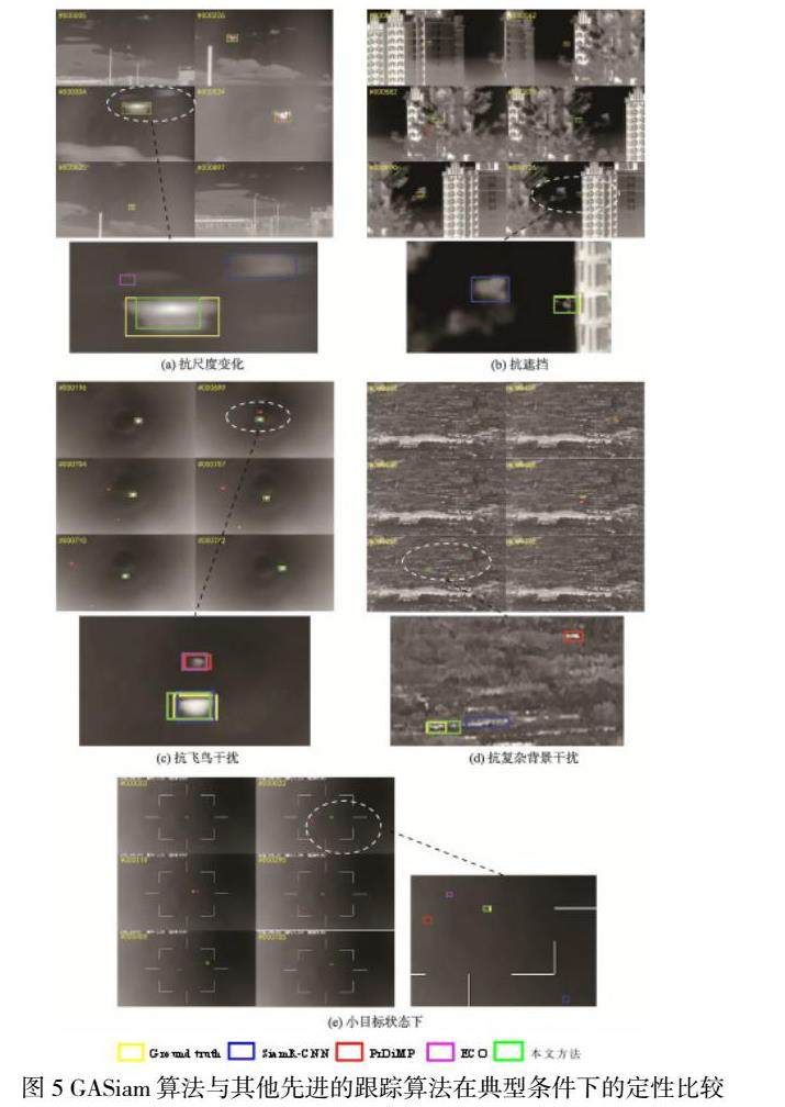 项目通过仿真和实验,分析了GASiam方法在实际应用中存在的一些共性问题,如:尺度变化、遮挡、飞鸟干扰、复杂背景、小型无人机等。从图5中可以看到,当面临这些问题时,这个算法能够获得更稳定的追踪。图中黄框是针对对象的真值框,绿框是GASiam算法的追踪效果,蓝框是SiamR-CNN追踪的效果,红框是PrDiMP追踪的效果,ECO算法追踪的结果是粉红框。每一段影像序列都会选择6帧的追踪结果,然后选择最重要的一帧来描述。