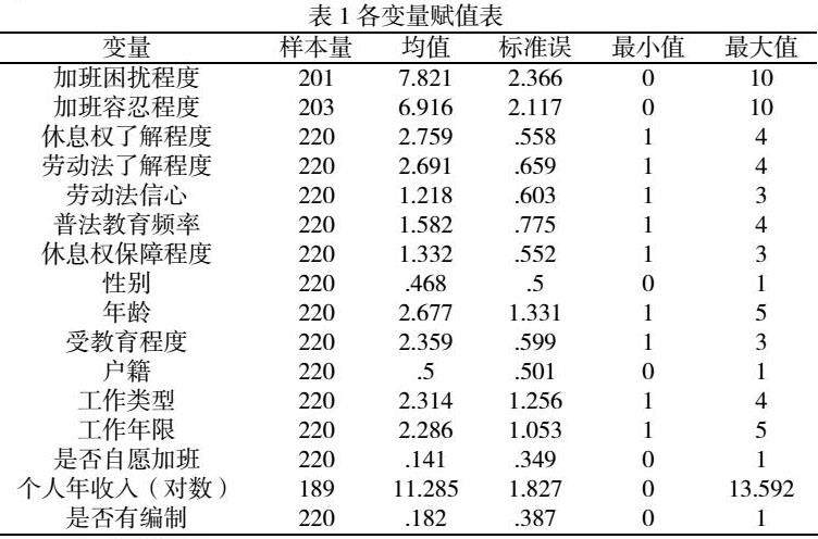 控制变量方面,本文结合以往研究,选取了性别、年龄、受教育程度、户籍、工作类型、工作年限、是否自愿加班、是否有编制以及个人年收入(考虑到收入的偏态分布,对其进行对数变换)。各变量的定义与统计如下表1所示。