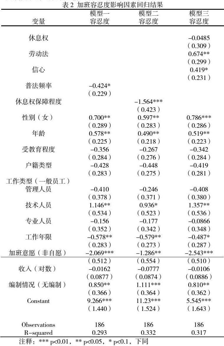 模型三为劳动法对加班容忍度的回归结果。如表2模型三所示,除休息权认知程度没有通过显著性检验之外,劳动法认知程度在0.95的置信度下显著影响加班容忍度,其回归系数符号为正,即劳动法认知程度与加班容忍度正相关,劳动法信心在0.90的置信度下显著影响加班容忍度,其回归系数为正,即劳动法信心与加班容忍度正相关。