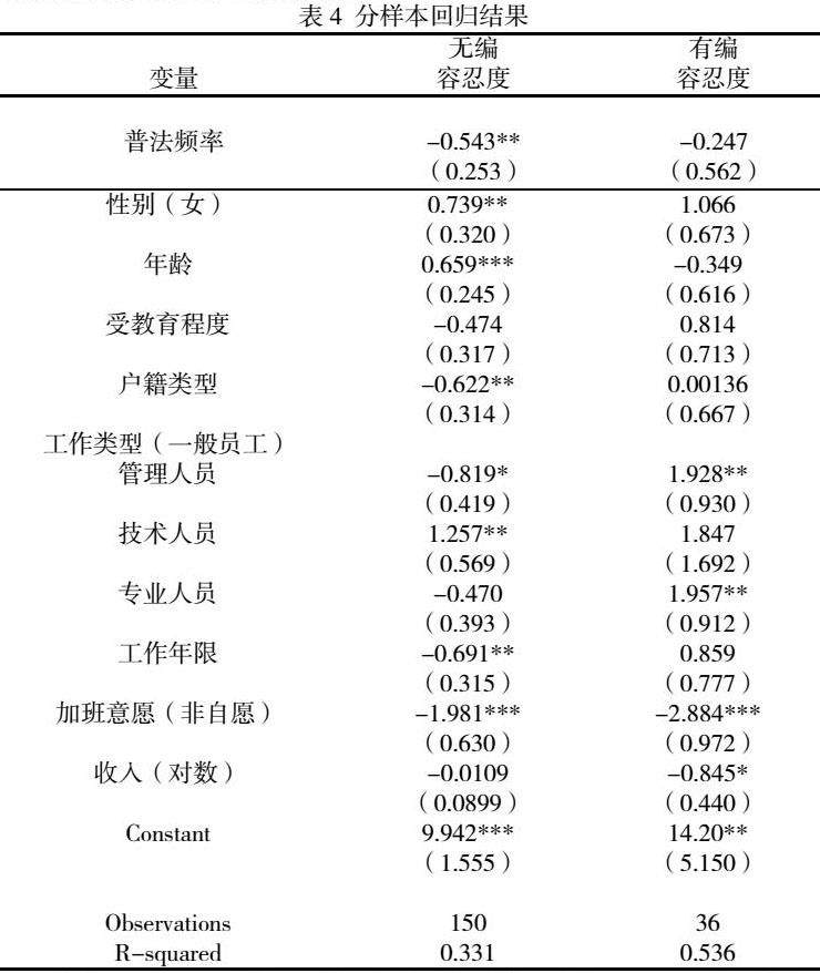 如表4,对于无编制组,普法频率与加班容忍度在0.95的置信显著负相关,而有编制组中普法频率并没有通过显著性检验,这说明对于编制内的劳动者,由于其工作可能不受劳动法保护,故劳动法的普及并不能显著改善这部分劳动者的加班容忍度。