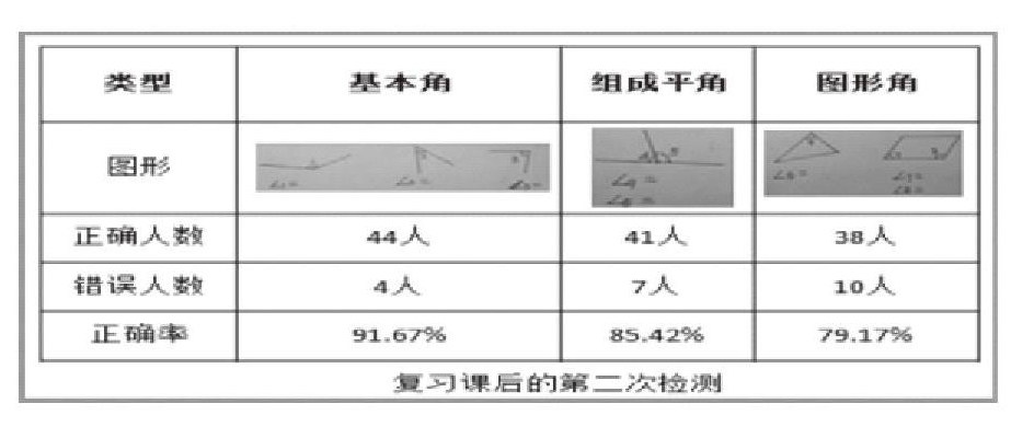 本次设计练习题类型有三种分别为:基本角、组成平角、图形角,练习的梯度由易到难,层层递进,主要检测学生对所学知识的灵活运用。具体情况如下:大部分学生能够掌握测量角的方法,并能准确地读数。其中,4人错题中有2人看错圈,有2人不能准备地读数。较之第一次检测量三类角正确率的平均值:(68.75%+58.33%+52.08%)÷3=59.72%,量基本角正确率提高了:91.67%-59.72%=31.95%,学生掌握测量角的方法正确率明显提高,实施的教学措施初见成效。学生量角的速度比原来的速度快了,测量起来自信心更强了,兴趣更浓了。