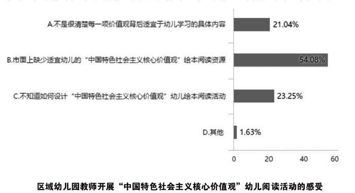 进一步对教师开展“中国特色社会主义核心价值观”幼儿阅读活动的感受调查,数据显示,54.08%的被调查者认为市面上缺少适宜幼儿的“中国特色社会主义核心价值观”绘本阅读资源,23.25%的被调查者认为不知道如何设计“中国特色社会主义核心价值观”幼儿绘本阅读活动,21.04%的被调查者认为不是很清楚每一项价值观背后适宜于幼儿学习的具体内容。这反映出当前幼儿园及其教师对中国特色社会主义核心价值观如何在幼儿园落地、如何采用绘本阅读活动形式进行教育存在一定的难度和困惑,需要给予针对性的指导和引导。