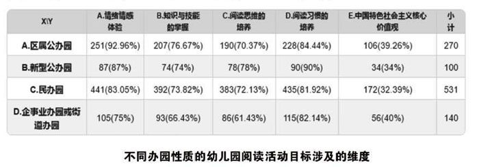 1.阅读活动目标:不同办园性质的幼儿园阅读活动目标涉及中国特色社会主义核心价值观的比例相近且偏低