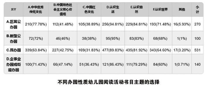 数据显示,各级各类幼儿园的被调查者在选择中国特色社会主义核心价值观主题的绘本书目所占比例均在41%-48%之间,不存在较大差别,反映当前不同办园性质幼儿园对该主题绘本的选择基本处于同一频率。
