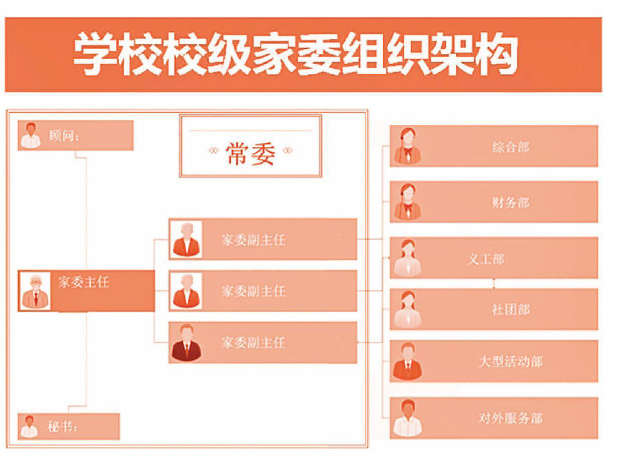 其次,通过“建架构”“三落实”做大家长委员会队伍。建架构是组建家长委员会的第一环节。每学年初,经过“家长自荐、教师推荐”产生每个班3-5名校级家委。再经过“班级家委互相推荐和自荐、学校考察确定候选人、家委会议表决通过”产生校级家委会领导成员,最后产生“主任一名,副主任三名,三名委员”的健全管理架构,协同学校实施管理。
