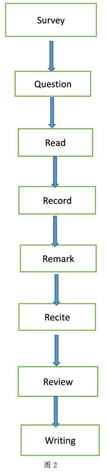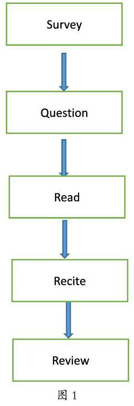 SQ3R学习法将学习分为5个步骤(如图1所示):第一步是浏览或纵览(Survey),指先略读文章,通过看作者序言、章节目录、摘要概述等获取文章的基本要素,如人物、时间、地点、事件,了解文章的主要内容、组织框架和中心思想,确定学习目的,或确定文章是否适合学习意图,难易程度如何,该采用怎样的方式去学等。第二步是提问(Question),略读文章后,记下自己对文章的疑问点,如“这篇文章要写什么”“到底发生了什么”“事件的整个过程是怎样的”。提问可以将阅读的过程变为解决问题的过程,通过吸引学生的好奇心,提高其阅读兴趣,使阅读的过程就像是循着藏宝图寻找宝藏,或是侦探从一个个疑点谜团中拼凑出事件真相般有趣,而提出问题和解决问题的过程也正是思考的过程,带着问题去阅读是一个主动思维的过程,正像孔子所说的“学而不思则罔,思而不学则殆”,如果一味读书而不思考就不能深刻理解书本的意义,不能合理有效利用书本的知识陷入迷茫。学会提问证明存在思考,有助于我们深入学习。第三步是阅读(Read),对所学内容进行通读、精读,寻找所提问题的答案,理解和赏析重要的章节、段落和语句。第四步是背诵(Recite),其实将其理解为复述更符合。指用自己的语言把有关章节的中心思想提纲挈领地复述出来。这样做可以对已学的内容进行系统的总结,训练口头表达能力的同时,提高思维的逻辑性。最后一步是复习(Review)指对所学知识的复习、巩固和消化的过程,能加强记忆,查漏补缺,还能与其它知识进行对比或联系形成一个系统的知识体系。