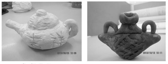 手工制作本身就是一种尊重学生天性的教学方式。刚进入初中阶段的七年级学生,对小学所习得的各种经验依旧记忆清晰。在《破解彩陶之谜》这一课中,笔者也比较注重学生在制作过程中的经历、感受和体验,包括制作陶器本身的实体体验,更重要的是在制作过程中所获得的情感体验。在制作或模仿之作陶器的过程中,学生可以充分体验制作的乐趣。更为重要的是学生可以具体、形象地感知历史,通过作品与作品背后世界的有效对话,与先民的对话,感受先民的智慧,从而增强民族认同感和自豪感;同时也加深对中华文明特征的理解。