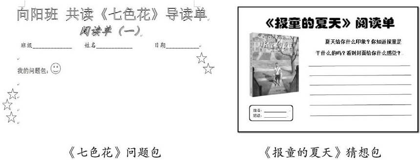 (2)推进阅读:巧用问题包,激发阅读兴趣。问题包的设置通常分别在读书前和读书中进行,提问的形式可以是学生设疑或教师提问。阅读前,通过学生对书名、封面、书脊的观察,教师进行简单提问。如,在阅读《七色花》前,学生们会提出疑问:“这朵七色花有什么特别之处?他有主人吗?”;进行日本文学《绿蹦蹦》阅读前,学生们提出了许多问题:“绿蹦蹦是谁?绿蹦蹦的旁边为什么会有一只猫头鹰呢?”“绿蹦蹦是因为会跳才起这个名字的吗?”在《报童的夏天》阅读前,笔者给学生设置了一个问题单:“夏天给你什么印象?你知道报童是干什么的吗?看到封面给你什么感觉?”而在阅读过程中,主要由学生进行提问,如,《报童的夏天》中,由于故事发生在美国,离学生实际较远,笔者设置了一张阅读单,里面就有“我的发现和疑问”一栏,让学生把在整本书阅读过程中遇到的疑惑记录下来,让阅读充满新奇。