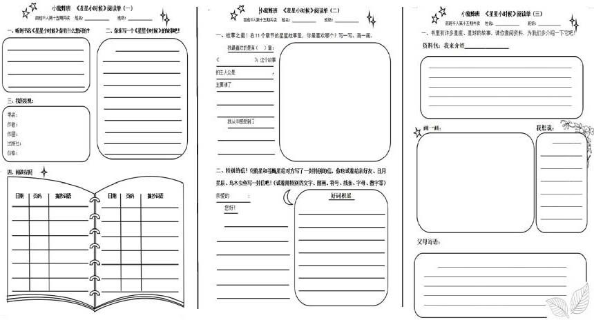 进行《星星小时候》整本书阅读的过程中,根据书目内容特点,笔者设置了三张阅读单(如下图),阅读单以教师导读为主,包含猜想疑问、阅读打卡记录、故事之最、资料拓展,等等: