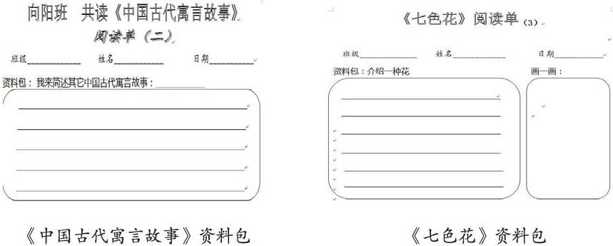 (1)资料包,补充拓展。学生通过对自己感兴趣的内容进行资料搜集、拓展,把它展示出来,从而延展了阅读的广度,丰富了知识,也是学生们非常喜欢的环节之一。读《中国古代寓言》,可让学生补充书上没有的故事;读《一直想飞的猫》,可让学生介绍猫的特点;教学《七色花》时,让学生搜集资料,整理几种自己所认识或不认识的花的简介;读《星星小时候》,可让学生介绍感兴趣的星体;读《狮子爸爸的茶会》,可介绍自己喜欢的甜点的制作;教学《绿蹦蹦》时,让学生拓展书中出现的感兴趣的事物……只要是学生们有兴趣的事物,都可以放在“资料包”中,让其自由讲解拓展,阅读便有了更多意思。