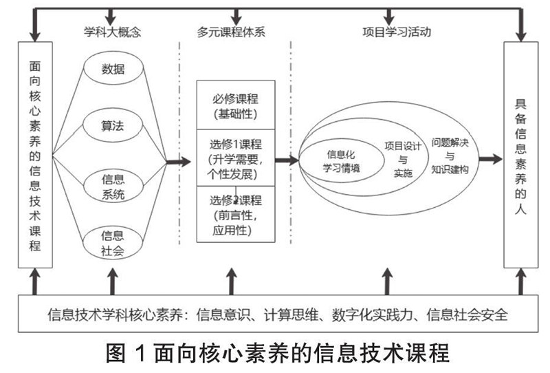 任友群等专家提出了面向核心素养的信息技术课程,树立以核心素养为纲的课程观,建构学科大概念,设置多元需求课程结构,渗透项目式学习方法,将核心素养渗透在课程各要素中,实现学科课程的学习缘由、知识内容、探究方法和交流方式一体化架构,如图所示: