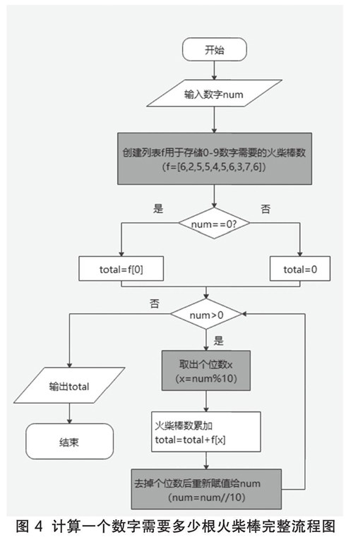 (1)编写程序按流程图的执行顺序来写,分别是通过输入语句input赋值给num(注:input函数收集的是字符串数据,需要用转换函数int转换为整数),赋值语句创建列表保存0~9火柴数字所需的火柴棒,双分支语句if…else,条件循环while,输出语句print。