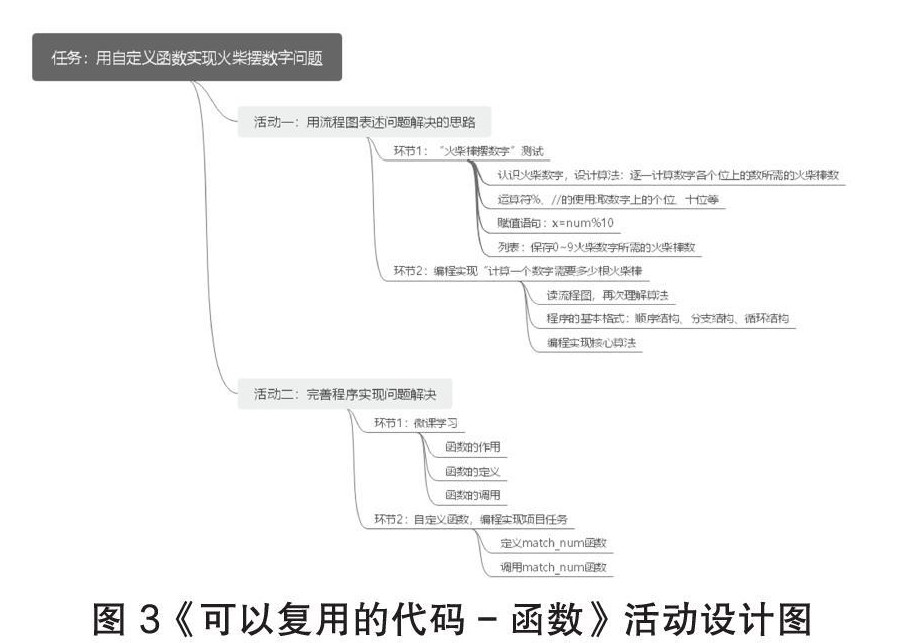 应用思维导图分析教材,结构清晰,能够帮助教师分析教材中的核心知识,抓准重点和难点,找准训练点。如果能在知识点和训练点之间找到路径,也就抓住了课堂教学的主线。《可以复用的代码-函数》一课中,要完成“解决火柴棒摆数字问题”这个项目,要有先前知识的储备,如循环结构、运算符(如何提取一个数的个位数、十位数、百位数等)等,也需要新知识的学习,如函数。因此,在课堂教学中,要设计活动巩固先前知识,也要设计新知识的学习,然后创建知识间的路径,在活动的指引下,帮助学生掌握新知,解决问题。