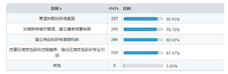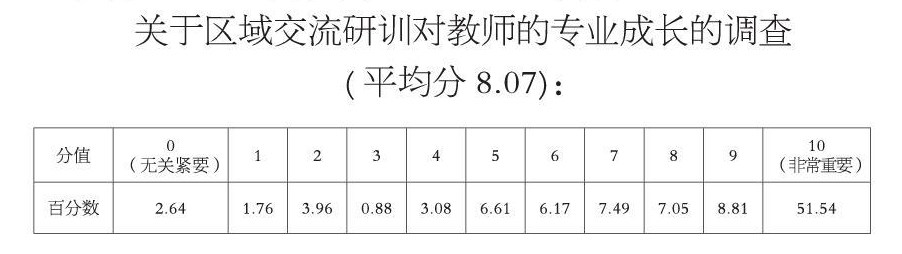 从数据调查情况看,多数教师对参加区域交流研训的重要性和作用有比较深刻的认识,他们希望、渴望参加区域交流研训,并把区域交流研训作为自己在专业上发展的有效途径及知识更新的主要窗口。