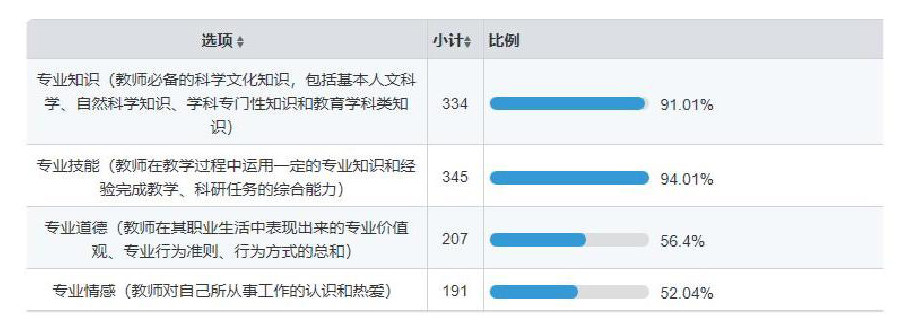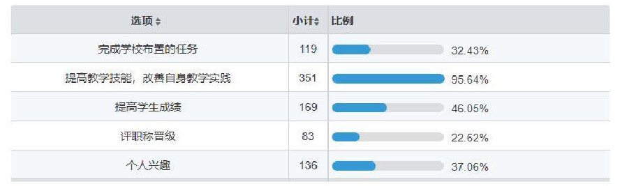 从数据调查情况看,有近七成教师都将成为学者型教师定位自己职业发展的最高目标,体现绝大多数的老师已经把教师当作终身事业而不是一份工作来做,也对自己的未来充满了期待。但不可否认的是,这样高定位、高目标,有可能模糊不少教师自我发展的目标和视线。教师专业成长如果不是处于自身的内在需求,不是着眼于整个教师队伍的发展,不是立足于学校的实际情况。那么,教师专业化发展就是一句空话。因此,我们在进行区域交流研训时,可以融入唤醒教师“专业自主”意识这一内容,让每一位教师都能将“上好课,教好书,育好人”作为教师专业化成长的核心目标和基石。