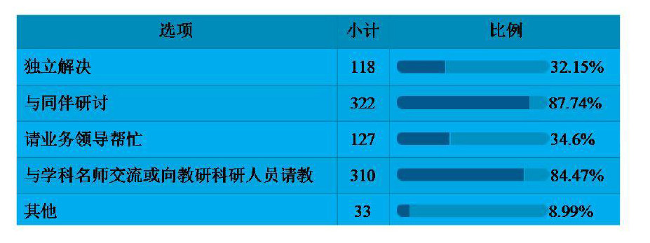 从数据调查情况看,近85%的老师在遇到困难的时候都迫切的需要学科名师及教科研人员的指导。因此,在推进区域交流研训一体化的同时,我们可以加大名师工作室的投入与扶持力度,进而提升名师工作室的示范作用。积极动员学科教研员兼任名师工作室首席专家或顾问,与名师团队、学员团队实施捆绑发展、动态管理,最终让学科的核心素养渗透到教学中去,同时区域内本学科的建设也得以飞跃发展。其次,依靠教育奖励经费和教师培训经费这两个经济后盾,充分发挥经济杠杆在促进教师专业化成长、提高教育质量方面的作用。
