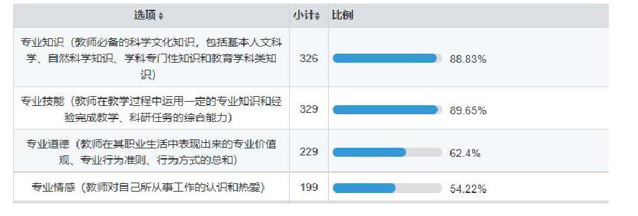 为了进一步做好助力粤西地区教师专业成长的工作,认真探索中小学教师在职教育工作的新思路、新途径、新模式,以中小学教师专业发展需求为出发点,针对性地通过区域交流研训有效地提高教师专业能力,为粤西地区中小学教师队伍的建设和茂名地区基础教育的发展提供优质的培训服务,广东省教育科研规划项目“开展区域交流研训助力教师专业成长的实践研究”课题组于2020年11月下旬成立了调研小组,于2020年12月1日至12月31日,采用书面问卷和电子问卷调查的方式,在粤西地区教师群体中进行了抽样调查。本次调研总计发放问卷367份,回收有效问卷367份,占发卷总数的100%。调研小组于2021年1月1日至2021年1月31日,对问卷数据进行了统计分析,对意见建议进行了整理汇总。问卷调查的内容涉及教师职业发展的最高目标、有效促进教师专业发展的方式、遇到有关问题后的主要表现、教师参加区域交流研训的态度及原因、参加研训的主要收获、希望参加的研训类别、希望参加研训的形式、研训存在的主要问题、研训存在的主要问题、希望哪些人员担任研训教师等方面。现围绕以上的问卷调查情况进行分析讨论,并提出在未来五年通过积极推进区域“研训评赛”一体工作,进一步助力粤西地区教师专业成长的七项对策。