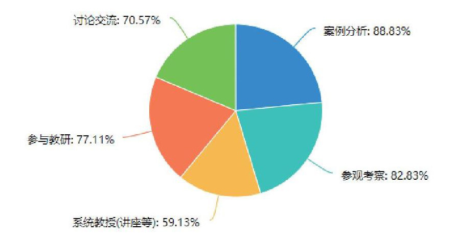 从数据调查情况看,参训教师更欢迎贴近教学一线的培训形式,如:实地参观考察型,案例分析、教学展示、共同研讨型,观看、评析名师课堂实录型等。同时,其他培训形式也是参训教师所需要的,如:与专家研讨互动、交流对话型,专家讲座、报告型等。
