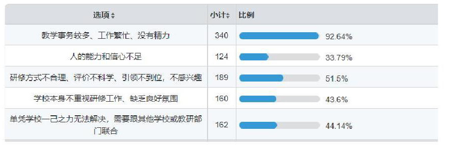 根据“影响、制约教师参与区域交流研训积极性的关键因素”的数据调查反映:
