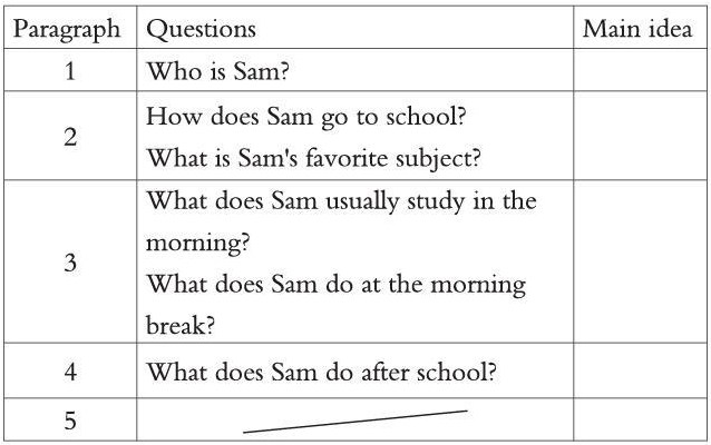 通过以上教学活动,学生在细读文章后根据提问找出细节内容,并根据方框中A-E五个选项的提示,归纳出每段的段落大意。学生不仅能够很好地理清阅读篇章的脉络,还能准确把握文本的主题,即介绍自己或他人的校园生活。