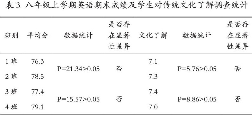笔者在本校八年级选取二个实验班和二个对比班,八年级(1)班和和八年级(3)班作为实验班,八年级(2)班和八年级(4)班作为对比班,由两位教师任教,每位教师分别负责一个实验班和一个对比班,在对比班使用原有的课堂教学模式,在实验班实施整改后的课堂教学模式(即融入了中国传统文化的教学模式)。首先对四个班级的英语成绩进行比较,使用Spss19.0对他们八年级上学期英语期末成绩平均分数和英语课堂中华传统文化了解状况进行了卡方分析,英语课堂中华传统文化了解状况以学生的个人得分作为评价标准(非常符合3分,比较符合2分,不符合1分),结果说明实验班和对比班的英语成绩不存在显著性差异,英语课堂中华传统文化了解状况也不存在显著性差异。