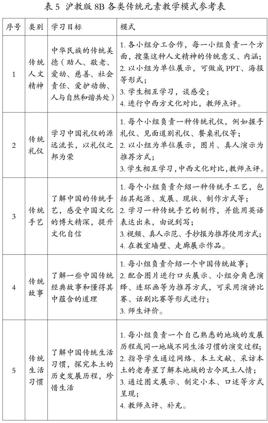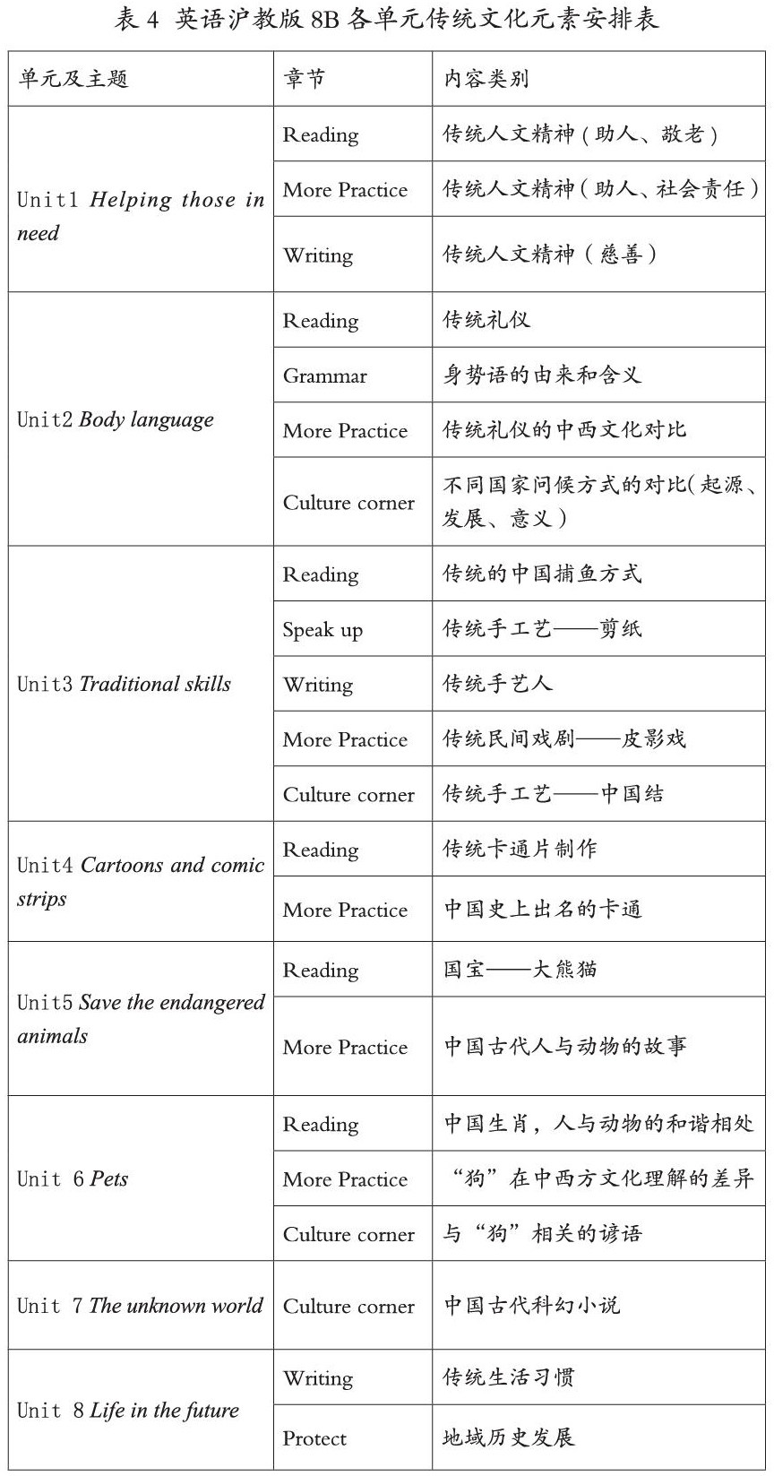 根据英语沪教版8B在单元上的安排,只有Unit 3 Traditional skills和Unit 4 Cartoons and comic strips两个单元出现传统文化的元素,普通一线教师无法更改教材的编排,且教材不能随便更换,否则无法维持教与学的稳定性,教材只是教学内容的载体,教师要根据课标要求和学生特点进行分析处理。我们通过深入分析、讨论研究和发掘,发现其实每个单元都有传统文化元素的隐形存在,所以能保证每个单元都能在课堂教学中渗透中华传统文化。我们在各学习内容的安排如下: