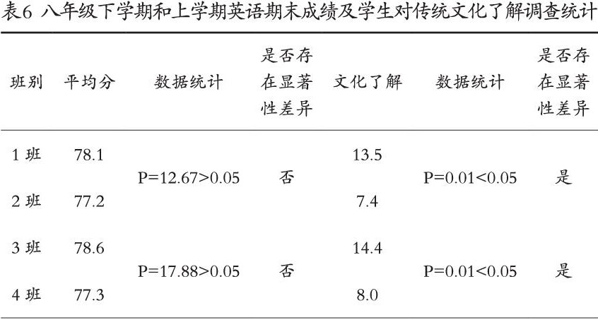 经过一学期的实践,我们检测一下在英语课堂中渗透中国传统文化带来的效果。用八年级下学期英语期末成绩与八年级上学期英语期末成绩进行对比。实践证明,虽然在英语课堂中渗透中国传统文化花费一定的时间,但不影响学生的英语成绩,甚至平均分还有一定的提高,而学生对传统文化的理解程度有明显提高,实验班和对比班得分存在显著差异,见表6。说明整改后的课堂教学模式具有可行性。