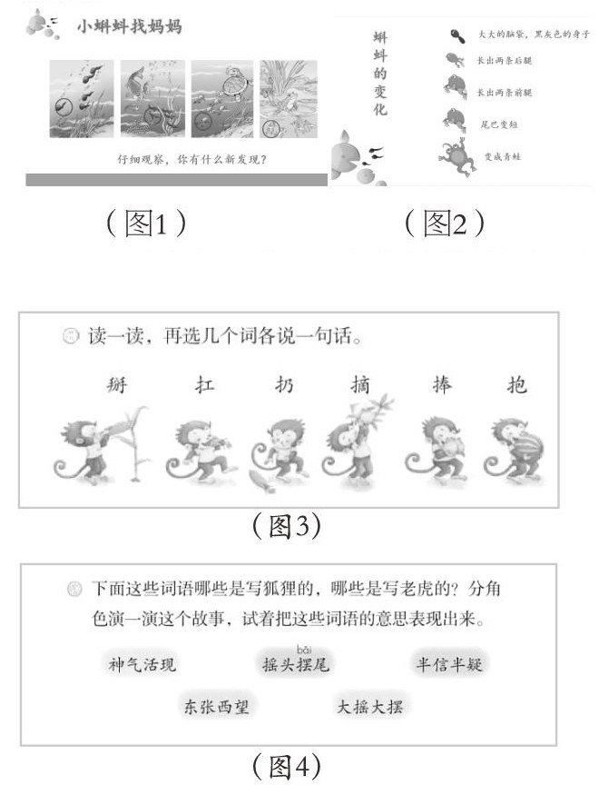 笔者在教学中使用图文结合的方式学习课文。老师范读时,在PPT中相机播放课文插图(见图1),让学生初步感知。接着引导学生观察对比四幅插图中小蝌蚪发生的变化,让学生借助图片理解变化的过程。