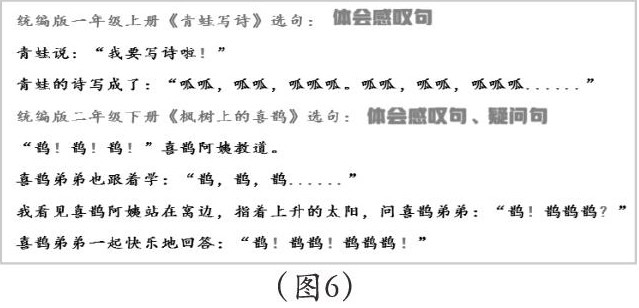 一年级的阅读教学以指导朗读,把课文读正确、读流利,能根据语义作恰当的停顿,能读出疑问句、感叹句、祈使句的语气。二年级则是在这基础上提出了进一步的要求:能对比独处感叹句和陈述句、反问句和陈述句的不同语气,在具体语境中带着自己的体会读出不同语气。(见图6)