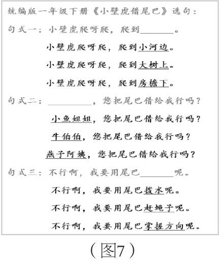 以统编版一年级下册《小壁虎借尾巴》为例。(见图7)课文第三到五段以对话形式呈现,表达相似、结构相似。第一组句子均在段首,交待小壁虎的去向,语句结构为“小壁虎爬呀爬,爬到____”。“爬”字共出现九次,说明小壁虎爬得远,表现出小壁虎借尾巴的艰辛。第二组句子在段中,反复出现的问句,请求对方借尾巴,表达出小壁虎恳求的语气。第三组句子在段尾,简单有礼的句子表达它们不借尾巴的原因,点明各自尾巴的作用。对结构相似的童话,笔者将教学重点放在第三自然段,引导学生自读,发现规律,即小壁虎到哪里找谁借尾巴,结果怎么样。后面两个自然段可放手自读。学生通过朗读反复式结构,发现其中规律,便可尝试创造属于自己的童话。