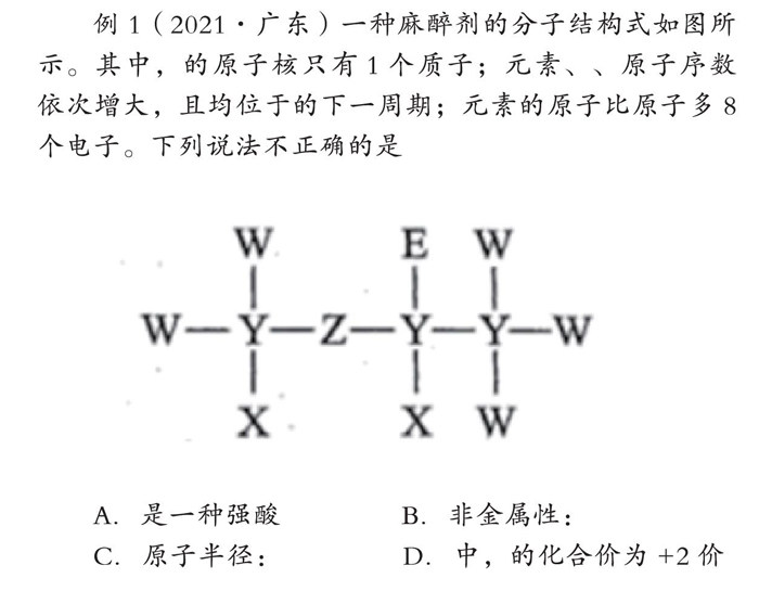 例1(2021·广东)一种麻醉剂的分子结构式如图所示。其中,的原子核只有1个质子;元素、、原子序数依次增大,且均位于的下一周期;元素的原子比原子多8个电子。下列说法不正确的是