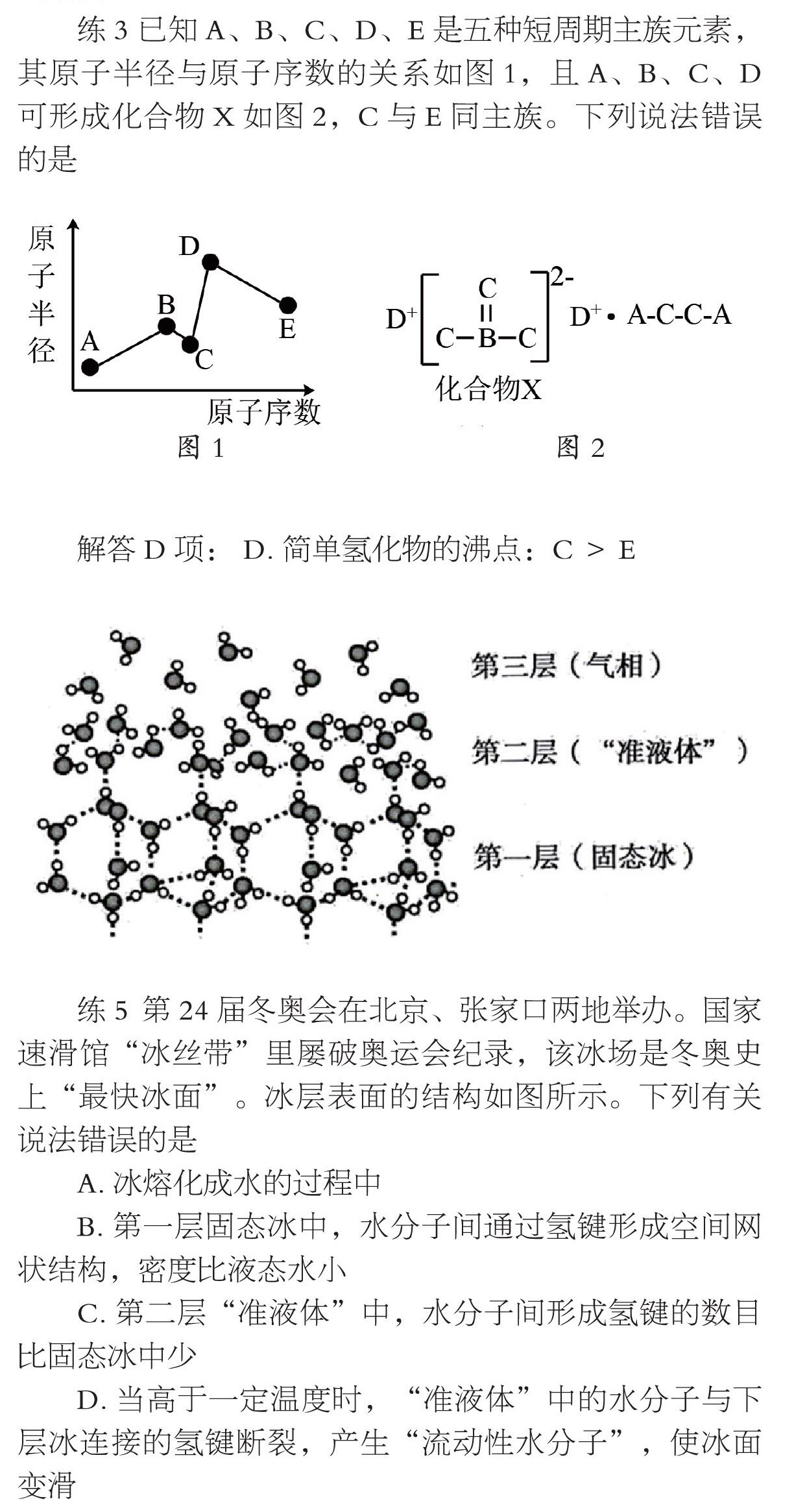 练3 已知A、B、C、D、E是五种短周期主族元素,其原子半径与原子序数的关系如图1,且A、B、C、D可形成化合物X如图2,C与E同主族。下列说法错误的是