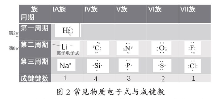教师通过对课前学习任务单的批改,对学生的认知基础有了一定的了解,再利用课堂上前15分钟,有针对性的进行问题的分析和解题方法的讲解。如针对常见原子电子式和成键数目关系的讲解如下图2: