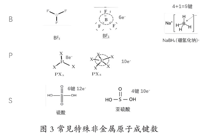 接着归纳常见的特殊非金属原子的成键数,以图3为例: