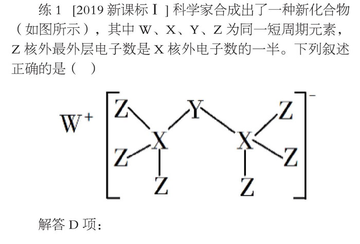 练1 [2019新课标Ⅰ]科学家合成出了一种新化合物(如图所示),其中W、X、Y、Z为同一短周期元素,Z核外最外层电子数是X核外电子数的一半。下列叙述正确的是( )