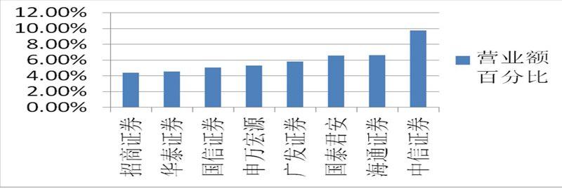 2015年中国证券行业总营业额:5751.55亿元,CR8=2761.87/5751.55%=48.02%。按照产业组织学家贝恩的市场结构划分方法,中国证券行业属于中(下)集中寡占型市场。按照日本学者植草益的市场结构划分方法,中国证券行业属于中度寡占型市场。