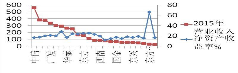 从表中我们可以看到,目前,在我国证券市场中,营业收入在100至300亿区间的券商净资产收益率相对更高,平均在20%以卜。与此对应,营业收入过多或过少的券商,其资产利用率相对较低。由此可见,在我国,营业额在100-300亿区间的券商更适合在我国目前的市场状态下发展。