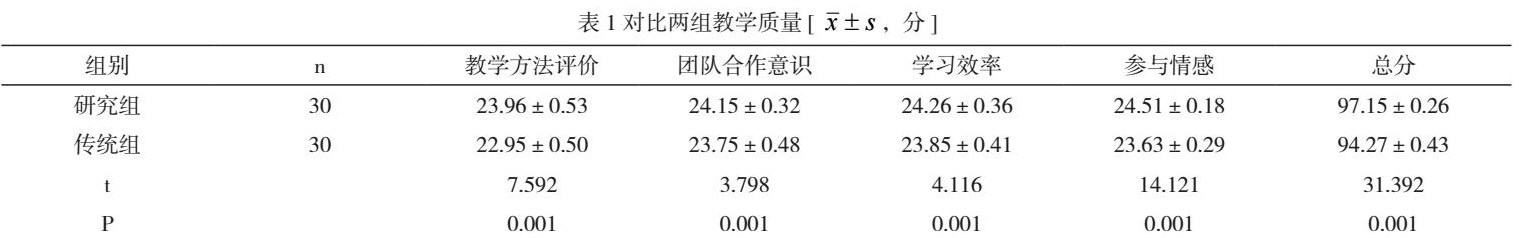 研究组教学方法评价、团队合作意识、学习效率、参与情感与总分均高于传统组,差异显著(P<0.05),见表1。