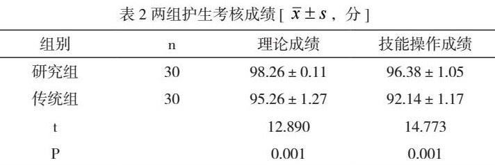 研究组理论成绩、技能操作成绩均高于传统组(P<0.05),见表2。