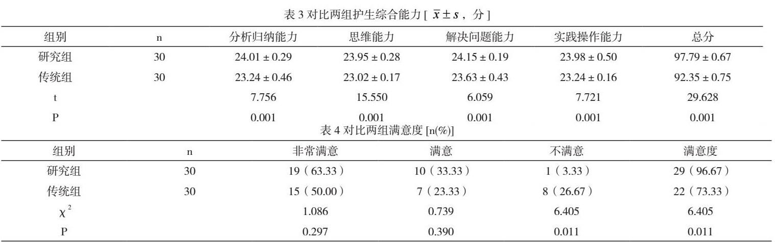 研究组分析归纳能力、思维能力、解决问题能力、实践操作能力与总分均较传统组高,差异显著(P<0.05),见表3。