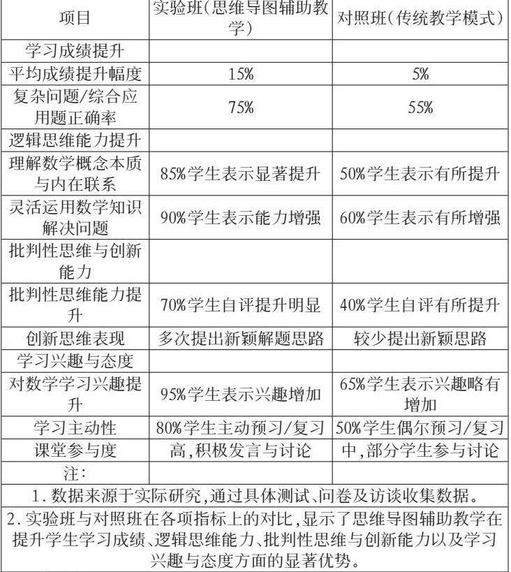 学习成绩的提升:通过前后测成绩对比发现,实验班学生的数学成绩显著高于对照班学生。特别是在解决复杂问题和综合应用题方面,实验班学生的表现更为突出。
