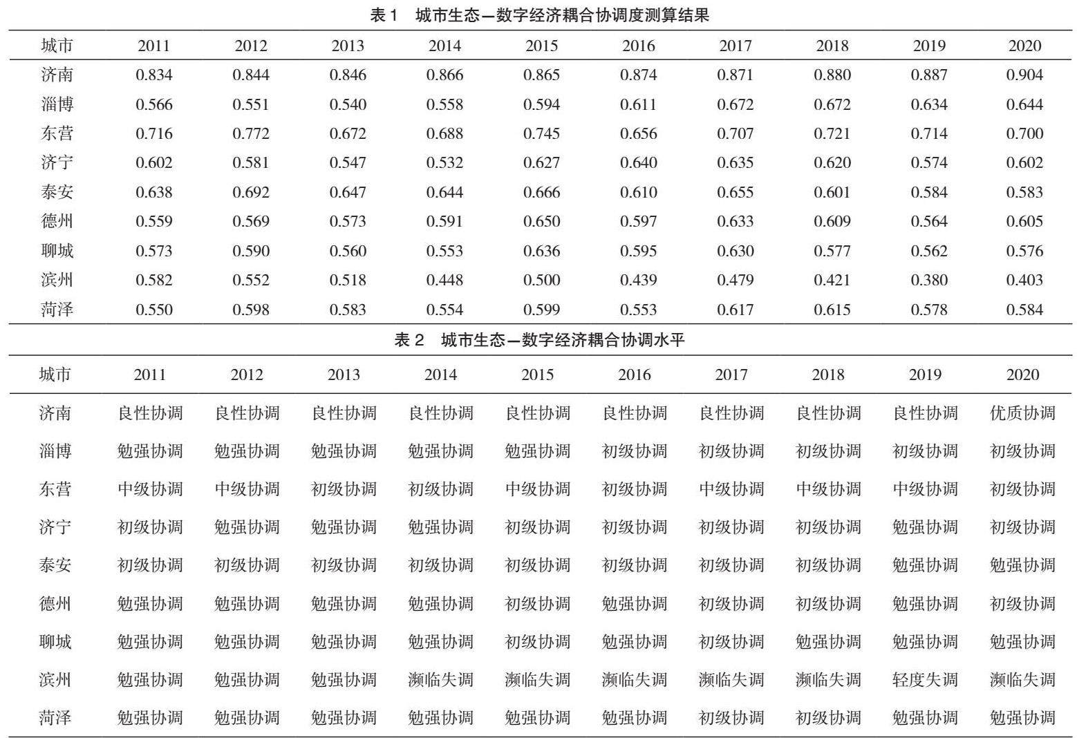 基于耦合协调度模型测算出2011—2020年黄河流域S段9个城市的生态-数字经济的耦合协调度结果。由表1和表2可知,黄河流域S段大多城市的耦合协调度呈现上升趋势,不同地区略微存在差异,其中济南从2011年以后总体呈现持续上升,而淄博、济宁、德州、聊城、菏泽呈现较为明显的波动变化,整体略微上升;另外,东营、泰安和滨州整体耦合度呈现下降趋势。说明S省济南市数字经济和城市生态之间相互作用强、关联程度高。这可能是因为济南作为省会城市一直贯彻绿色发展的政策要义,加大经济投入的同时主动发展新能源数字经济,打造河南黄河流域S段新的增长点,快速交通体系进程一直在完善,城市能级一直在提高,从而使得数字经济和能源生态之间的耦合协调水平较高。东营、泰安和滨州的耦合协调度下降,这可能是受到地理区位限制和生态环境质量低下以及生态环境压力等原因,导致耦合协调度逐渐下降。经济活力低下,以重工业为主,同时工业废水排放量较大以及废水处理率进一步加大其生态环境压力,导致这几个城市在城市生态和数字经济之间的耦合协调作用较低。