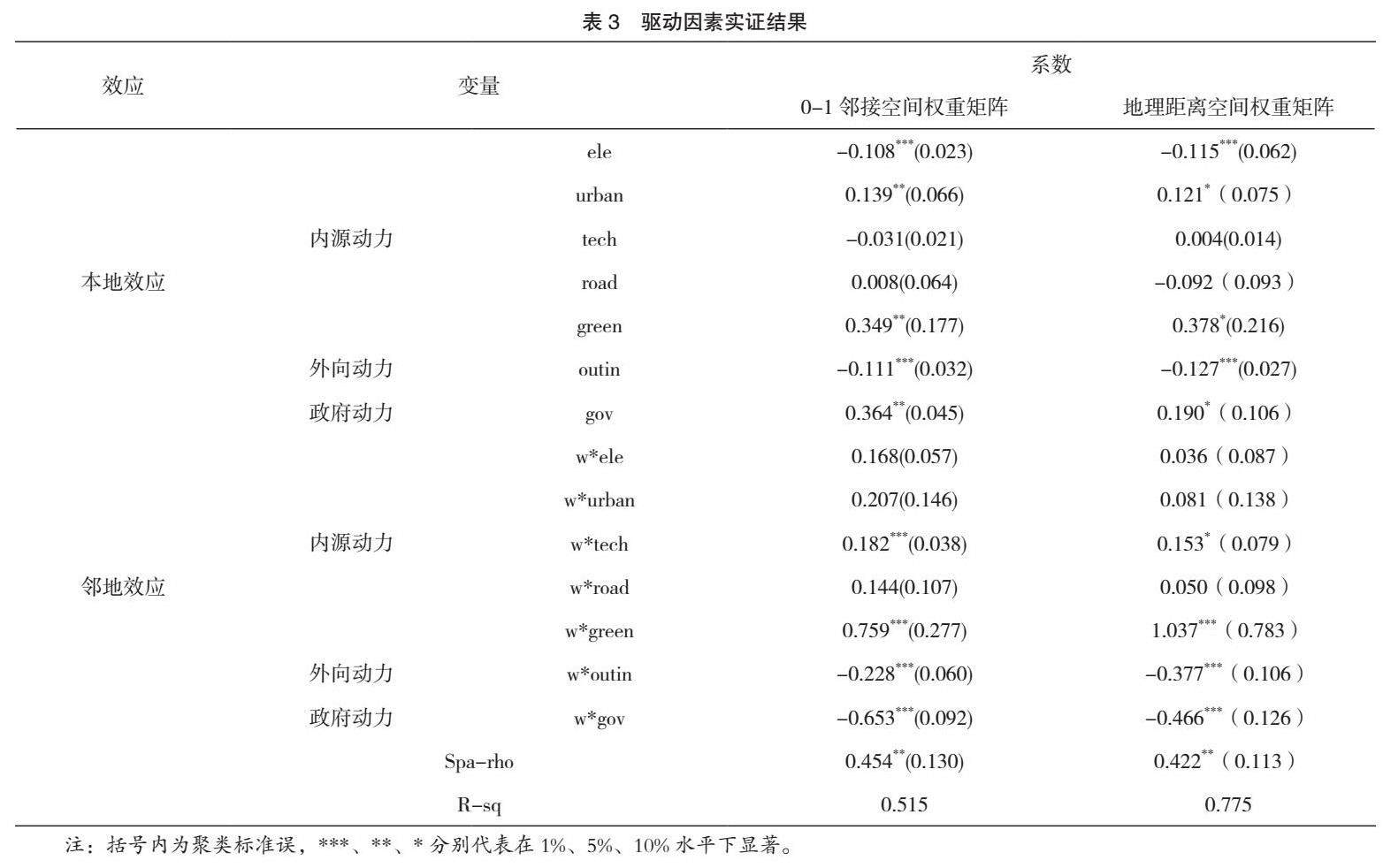 首先,从内源动力、外向动力和政府动力三方面对驱动因素的本地效应进行分析。第一在内源动力中,资源消耗度、城镇化水平、禀赋推动力都对耦合度产生了显著影响。资源消耗度会抑制城市生态与数字经济的耦合发展。S省一直是一个用电大省,任何行业的发展离不开电力的支持,这正是其背后的产业结构所致。虽然近年来S省大力发展可再生能源发电,促进清洁型电力生产,控制煤电使用度,但从实证结果分析来看,沿黄城市的行业生产还主要依靠煤炭发电,污染排放严重,致使生态环境下行,与促进生态高质量发展的理念背道而驰。城镇化水平会促进城市生态与数字经济的耦合发展。说明S段沿黄城市的城镇化已经迈入了高质量发展阶段,城镇化与生态经济处于协同发展阶段,人类的生产生活能够与生态经济处于一种和谐的关系。一方面高度文明的城镇化会增加对高科技人才的吸引力和聚集力,加速沿黄城市第三产业发展;另一方面,人类生活污水排放经过科技净化之后流入大自然,减少了废水的污染排放。禀赋推动力对耦合发展表现出明显的正向推动影响作用,城镇绿化率每提高1%,耦合度平均增加34.9%,这与城镇绿化率的规模有一定的关系。只有在城镇绿化覆盖面积达到相当规模时,才能足够的能力将经济生产中的废气排放物吸收转换,促进城市生态与数字经济的耦合发展。第二外向动力对耦合度表现出显著的负向影响作用。在对外开放水平不断加大的态势下,这是值得重点关注的地方。根据“污染避难所”原理,发达国家会将污染严重的生产制造厂建立在发展中国家环境规制度低的地区,将污染转移,破坏发展中国家的生态环境,降低生态与数字经济的耦合度。第三政府动力对城市生态与数字经济的耦合发展表现出显著的正向促进作用。在所有的驱动因素中,政府动力的驱动效应最为明显。财政支出每增加1%,耦合度平均就会增加36.4%。政府动力通过促进内源动力中的科技投入和城镇绿化率发展,最终作用于城市生态与数字经济的耦合发展。各个城市将国家的财政拨款用于生态保护和数字化经济发展,一方面数字化生产、清洁生产可以从源头上遏制废水、废气的排放,另一方面绿化覆盖加大对生态环境的净化,两者协同作用,共同促进城市生态与数字经济友好协同发展。在两者耦合发展取得显著成效时,国家也会持续增加财政预算支持,促进两者长效协同发展,形成内源动力和政府动力持续促进生态与数字经济耦合发展的良性循环格局。