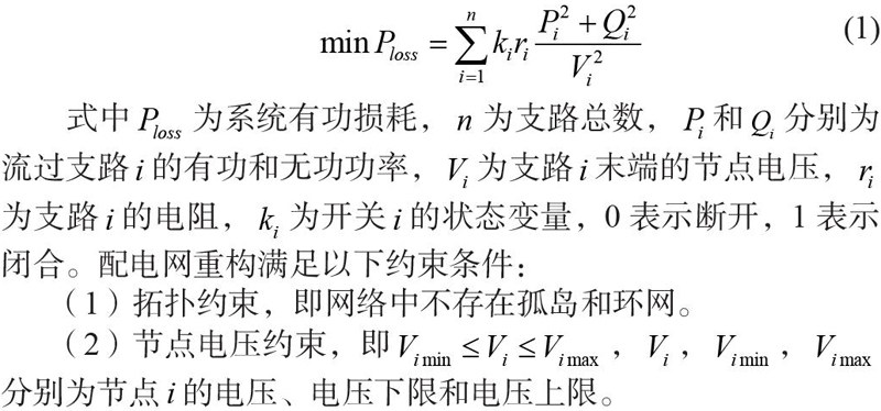 式中为系统有功损耗,为支路总数,和分别为流过支路的有功和无功功率,为支路末端的节点电压,为支路的电阻,为开关的状态变量,0表示断开,1表示闭合。配电网重构满足以下约束条件: