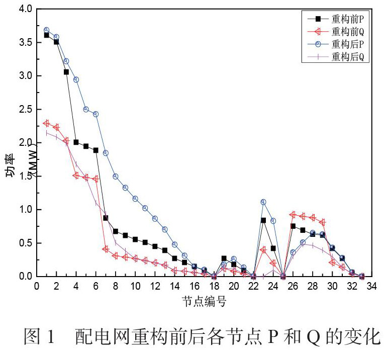 图2显示了基于改进蛙跳算法的配电网重构方法重构前和重构后各节点有功功率P和无功功率Q的变化。从图1中看出,配电网重构后的有功功率随节点的变化规律基本一致,但总体有功功率P略高于重构之前,在4个DG接入位置附近,P值明显增高,特别在节点8接入DG时,其P值可由0.6750MW增加至1.4955MW,增幅达121.55%,而IEEE33节点配网测试系统的总P值由重构前的26.0487MW增至33.2588MW。另外,重构后各节点的无功功率Q值较重构之前更加均衡。